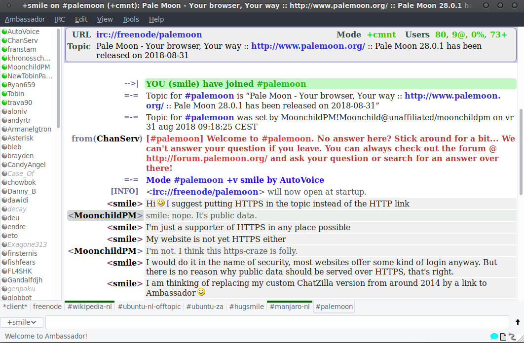 Ambassador is a chat program which can be used to chat in #hugsmile, a chat channel (chat room) where I am often online.